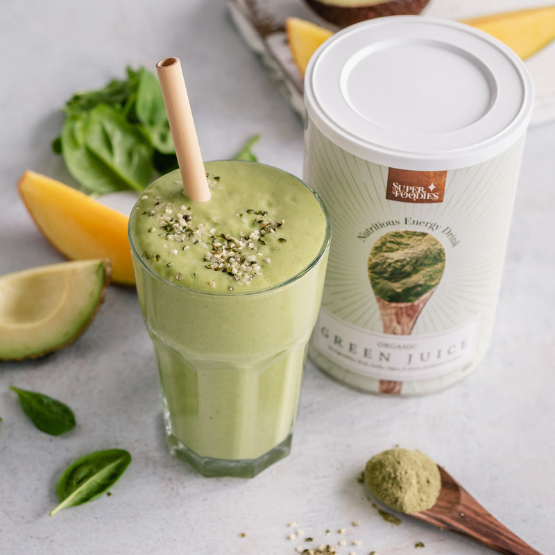 Green Juice van Superfoodies met heerlijke smaak is ideaal ter vervanging van je groene smoothies of sap. Je hoeft alleen maar wat poeder door een glas koud (bron)water te roeren en je groene sap is klaar.