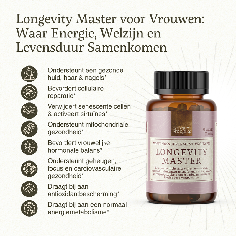 Longevity Master for Women is een compleet anti-verouderingssupplement, speciaal ontwikkeld voor vrouwen ter ondersteuning van hormonale balans, energiemetabolisme, huidelasticiteit en langdurige vitaliteit. Deze geavanceerde formule combineert 13 wetenschappelijk onderbouwde stoffen, waaronder NAD⁺, resveratrol, CoQ10, biotine en rode klaver om gezond en veerkrachtig ouder worden op cellulair niveau te bevorderen, zonder gebruik van hormonen of stimulerende middelen.