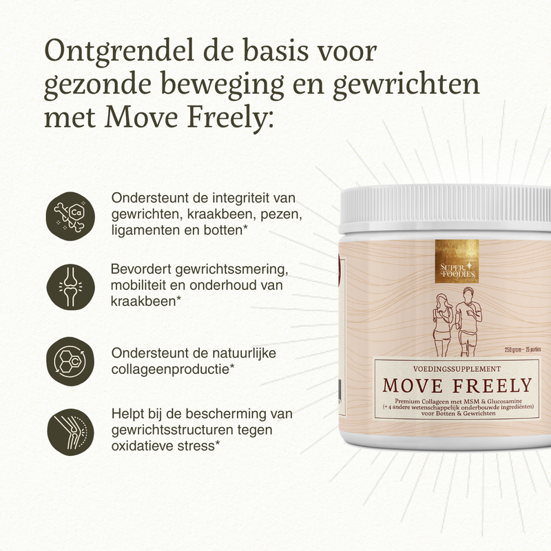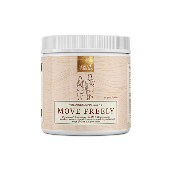 Move Freely is een premium collageenpoeder uit meerdere bronnen, ontwikkeld om de gezondheid van de gewrichten, mobiliteit en algemene fysieke veerkracht te ondersteunen. Met 10 gram collageenpeptiden per portie, samen met glucosamine, chondroïtine, MSM, hyaluronzuur, vitamine C en bamboe-extract biedt deze pure (ongezoete) formule een complete mix van voedingsstoffen die kraakbeen, bindweefsel en huid van binnenuit voeden.