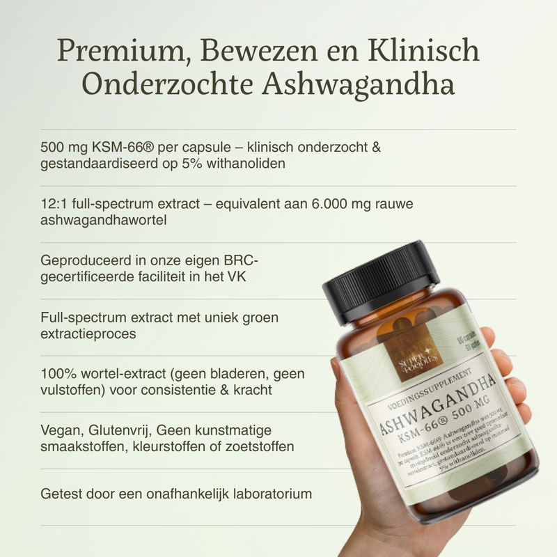 Premium Full-Spectrum Extract: Gemaakt met KSM-66®, een klinisch bestudeerd wortel-extract van ashwagandha, uitsluitend uit de wortel, gestandaardiseerd op 5% withanoliden voor kracht, zuiverheid en superieure biologische beschikbaarheid.
