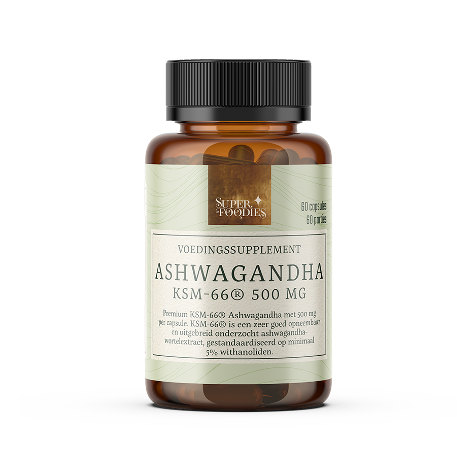 Superfoodies Ashwagandha KSM-66 is een voedingssupplement met KSM-66® ashwagandha, een hoogwaardig volledig spectrum wortelextract van Withania somnifera. Elke vegan capsule levert 500 mg gestandaardiseerd wortelextract (12:1), met minimaal 5% withanoliden en gelijk aan 6.000 mg gedroogde wortel. Het extract wordt geproduceerd via een groene extractiemethode en vervaardigd in een BRC-gecertificeerde faciliteit in het Verenigd Koninkrijk.