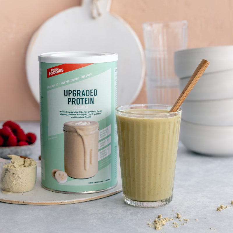 Zoek jij een shake die smaakt als een milkshake, maar je lichaam een boost aan vitamines en voedingsstoffen geeft zoals alle essentiële B vitamines, vitamine C en Magnesium? Een complete eiwitbron van uitsluitend plantaardige eiwitten dat jouw geestelijke en lichamelijke energiehuishouding, botten en stresssysteem op een natuurlijke manier ondersteunt? Met onze heerlijke bananenshake Upgraded Protein Recover vol goede voedingsstoffen kom jij voortaan guilty free jouw veeleisende en drukke dagen door!